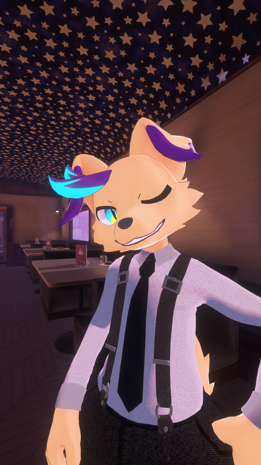 A set of clothing I designed for the Regulus by Gigash. The tie and suspenders are rigged and can flap freely, and the entire set of clothing is less than 6k polygons. Comes with special shape keys including one for shoes (coming soon!), and to un-tuck the shirt if it was to be worn on its own.
